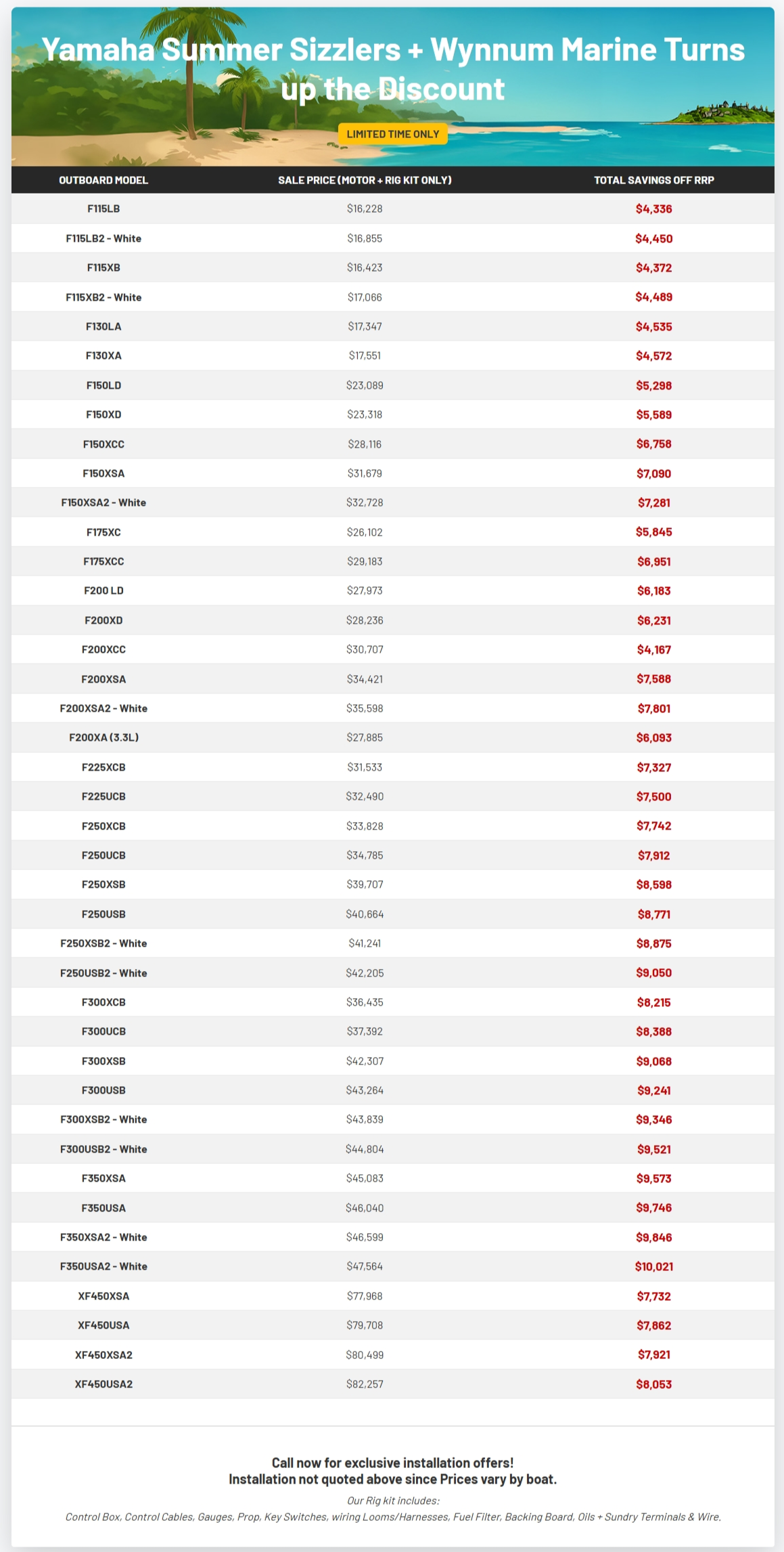 ***Prices are not inclusive of accessories or fitting as required. Yamaha Outboard products are mandatorily required to be installed and delivered by the supplying Yamaha Outboard dealership as specified by Yamaha Australia***